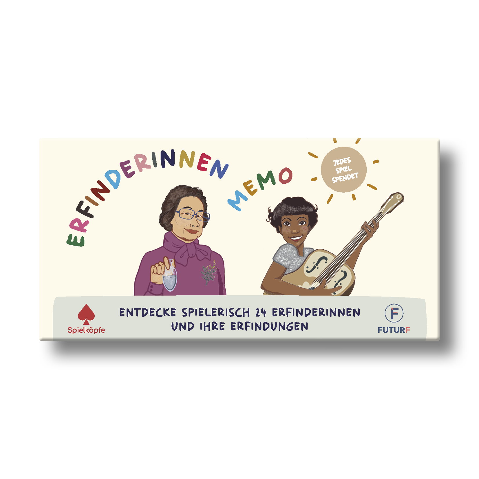 Weil wir an Kooperation statt Konkurrenz glauben und gerne Dinge gemeinsam realisieren, sind wir super froh, dass Sarah und Jonas vom gemeinnützigen Impact-Start-Up Futur F mit Sarah’s Idee für ein Erfinderinnen Memo Spiel zu uns gekommen sind. Ihr Motto „Fix the System, not Women!“ passt perfekt zu unserer Spielköpfe Vision und so haben wir das Erfinderinnen Memo gemeinsam realisiert und gestaltet und wurden dabei von weiteren Partner*innen unterstützt.
